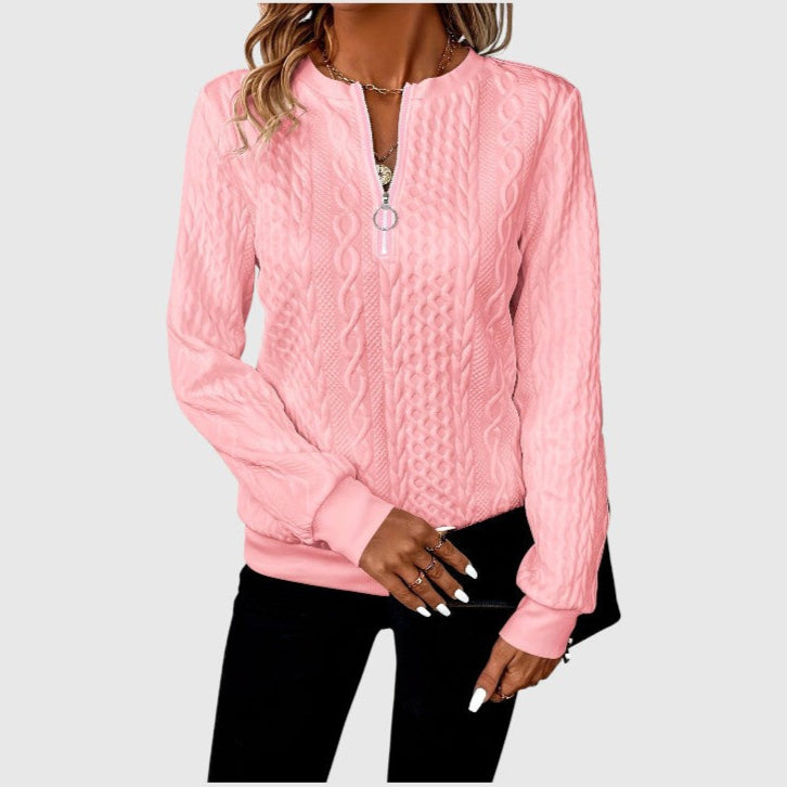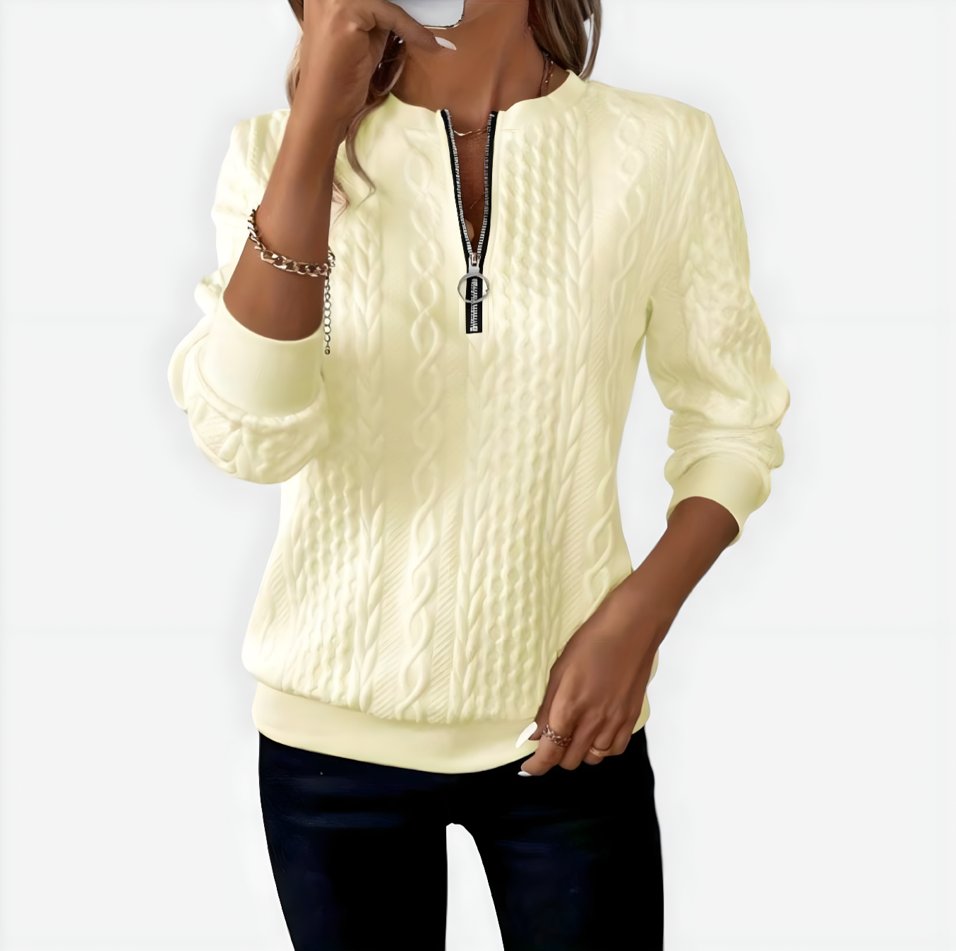 Podignite svoj ležerni stil s našim pletenim puloverom s patentnim zatvaračem AMALIE. Ovaj ženski pulover spaja toplinu i modernu modu, čineći ga neizostavnim komadom vaše garderobe. Izrađen od mekane i izdržljive tkanine, pruža opušteno pristajanje koje jamči chic izgled dok vas grije.