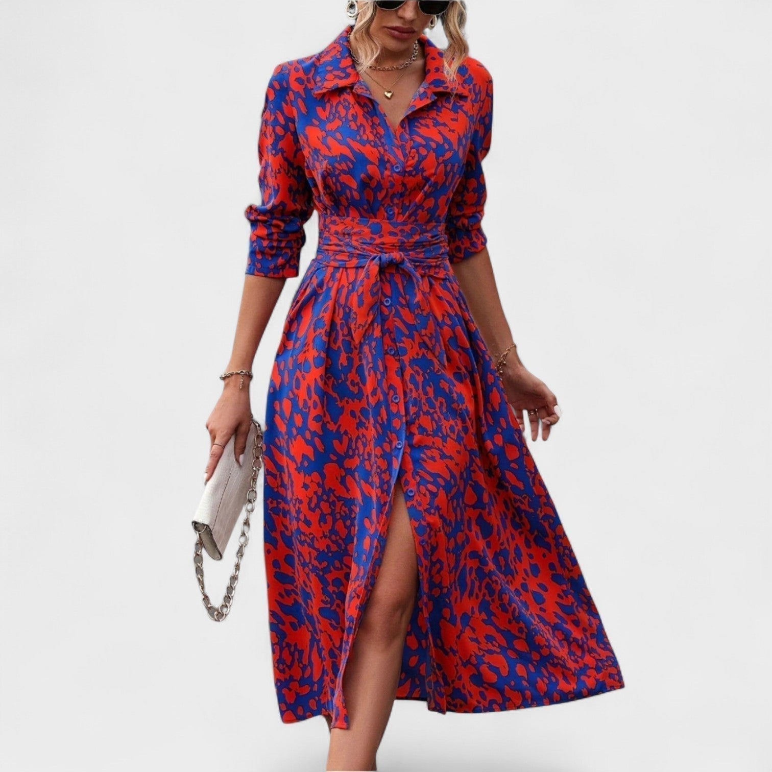 Odvažan i moderan dizajn, savršen za one koji vole istaknuti se s sofisticiranošću. Haljina Camila spaja klasičan košuljski kroj s vibrantnim životinjskim uzorkom u plavoj i crvenoj boji, idealna za događaje gdje želite ostaviti dojam bez gubitka elegancije.