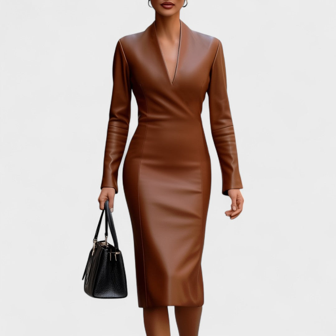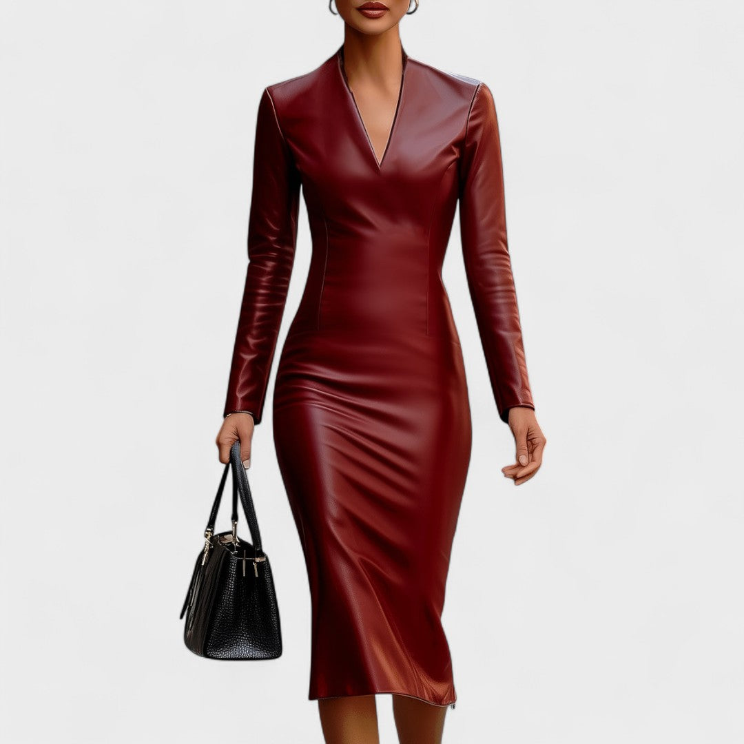 Ova uska haljina od umjetne kože savršen je izbor za žene koje žele istaknuti svoju samouvjerenost i sofisticiranost. Moderni kroj koji prati liniju tijela naglašava figuru, dok materijal visokog sjaja daje odvažan i luksuzan izgled. Idealna je za večernje izlaske, posebne događaje ili trenutke kada želite ostaviti snažan dojam.