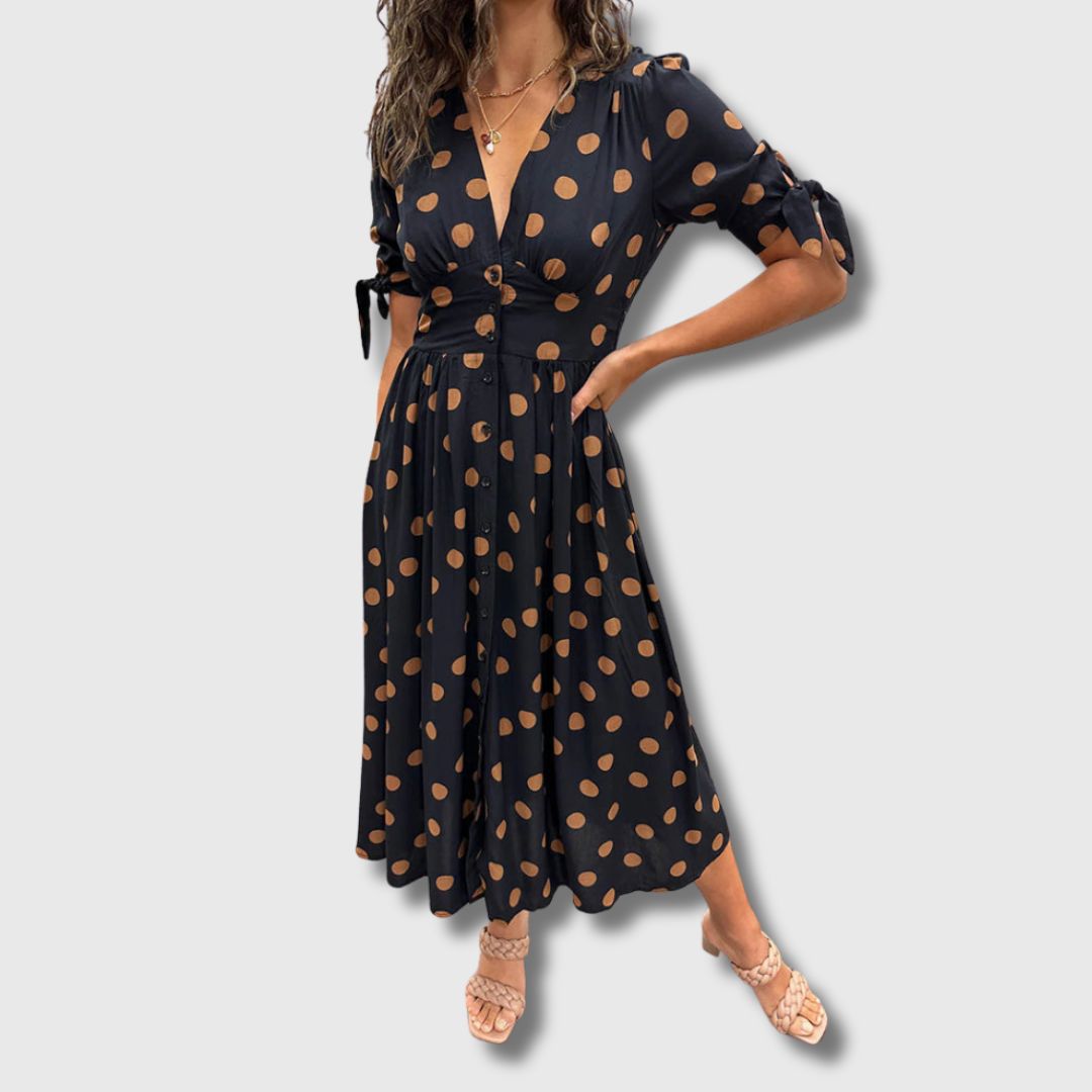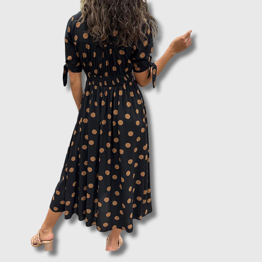 Monique haljina spaja klasiku i suvremenost – uzorak na točkice unosi razigranost, dok profinjeni kroj naglašava ženstvenost i eleganciju. Idealna je za poslovne prilike, svečane trenutke ili ležerne šetnje gradom. Lagana tkanina pruža udobnost, a kroj koji prati liniju tijela daje haljini svestrani karakter.