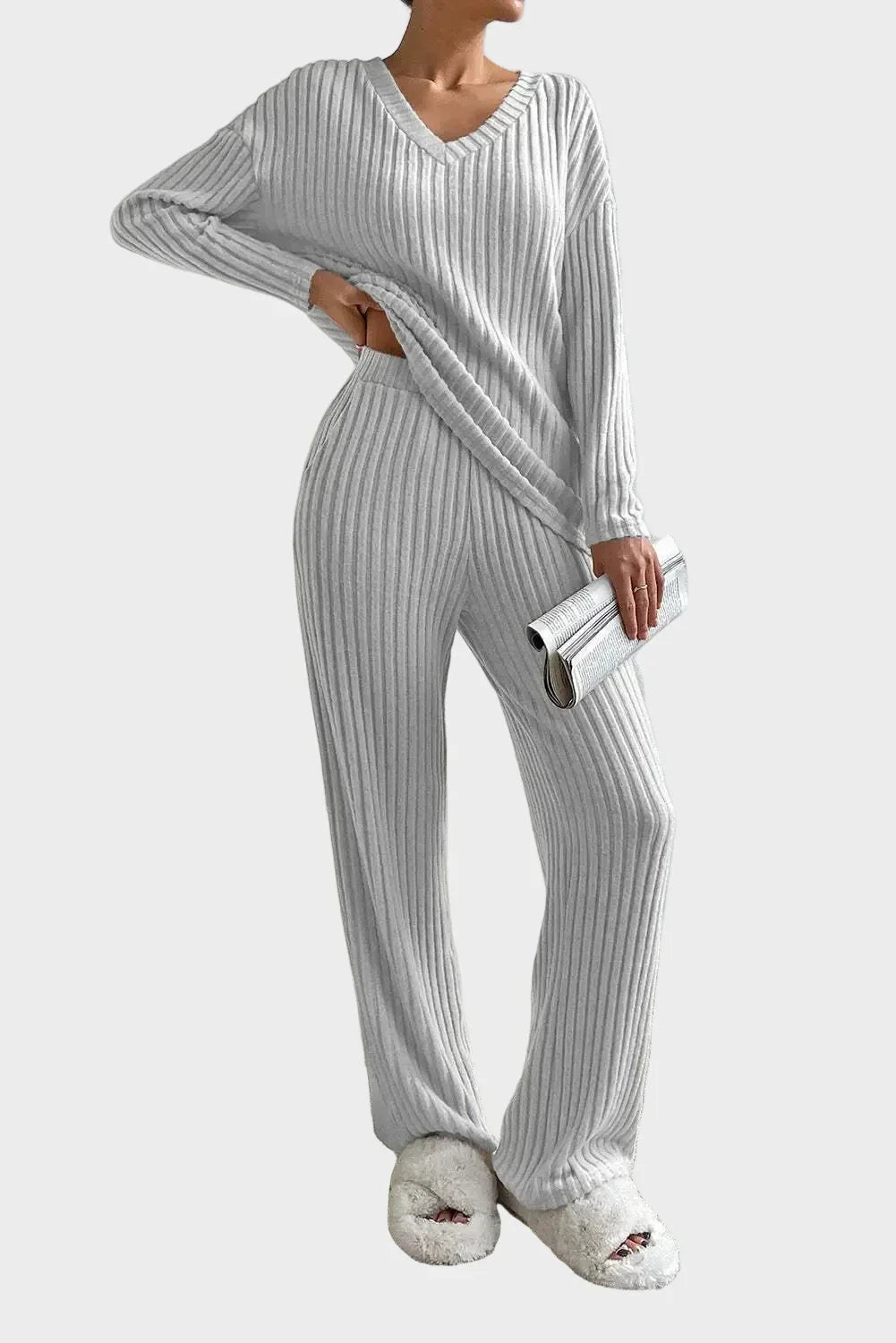 Ovaj elegantni rebrasto pleteni set spaja vrhunsku udobnost s modernim, profinjenim izgledom.