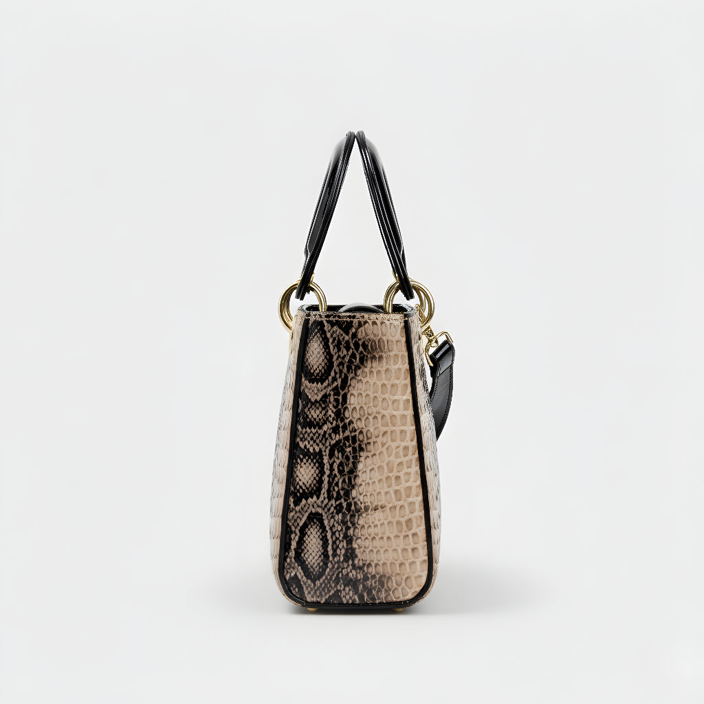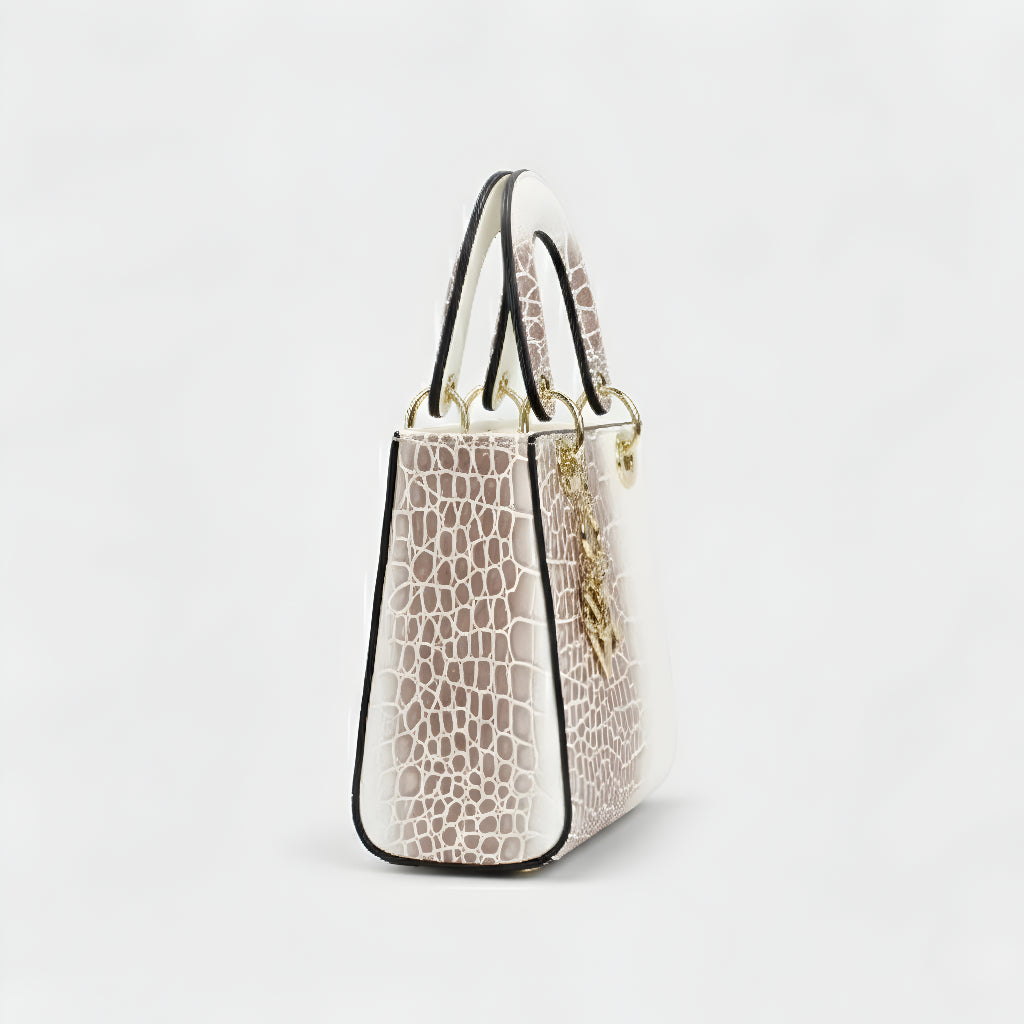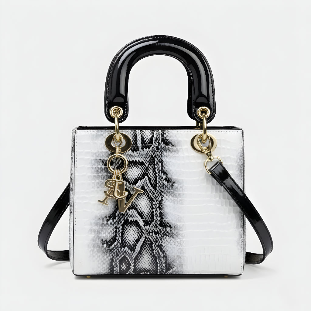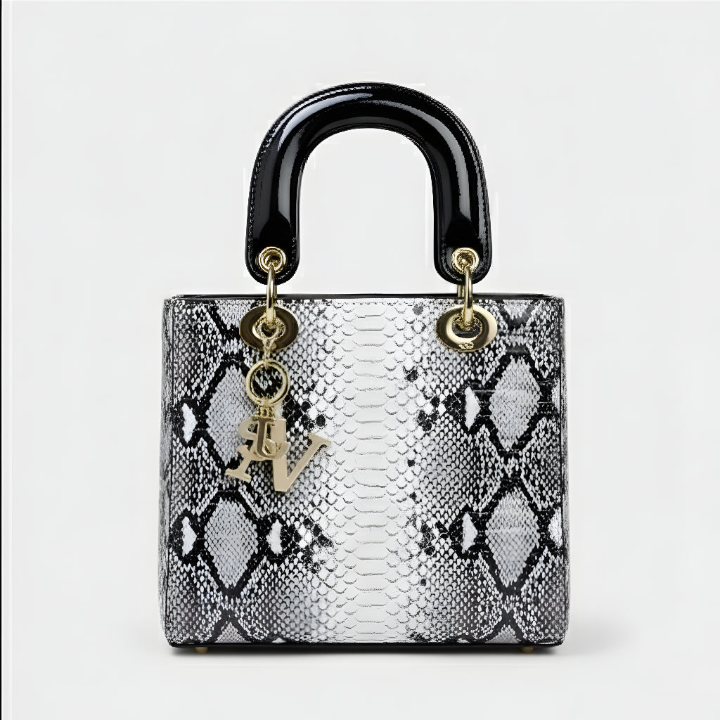Sa sofisticiranim završetkom u životinjskoj teksturi i metalnim dijelovima visokog sjaja, ova torba je definicija profinjenosti. Strukturirana, s dvostrukim ručkama i dugom uklonjivom trakom, nudi svestranost koja odgovara od formalnih događaja do ležernih trenutaka sa stilom. Aksesor koji trenutno podiže svaku kombinaciju, donoseći šarm i autoritet.