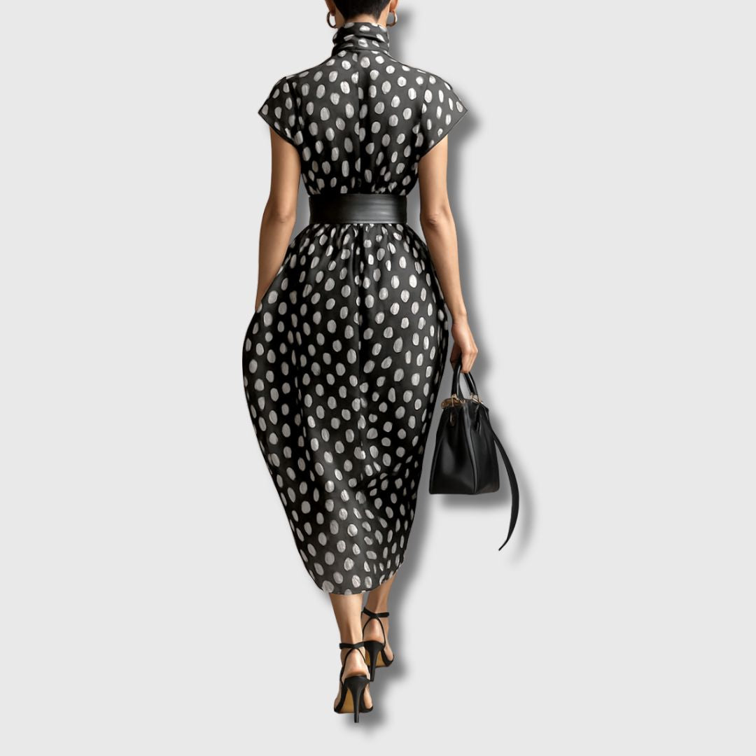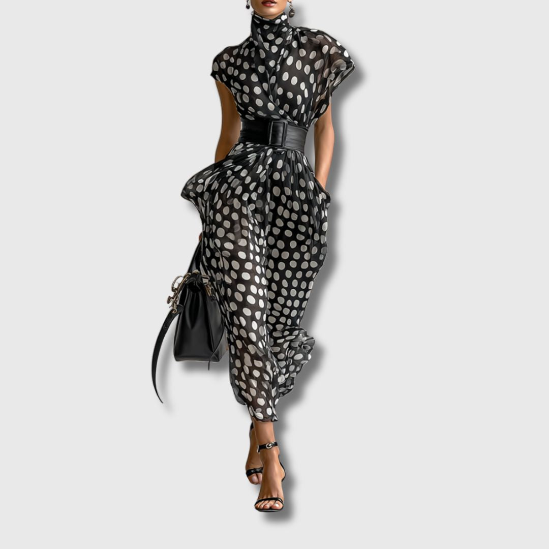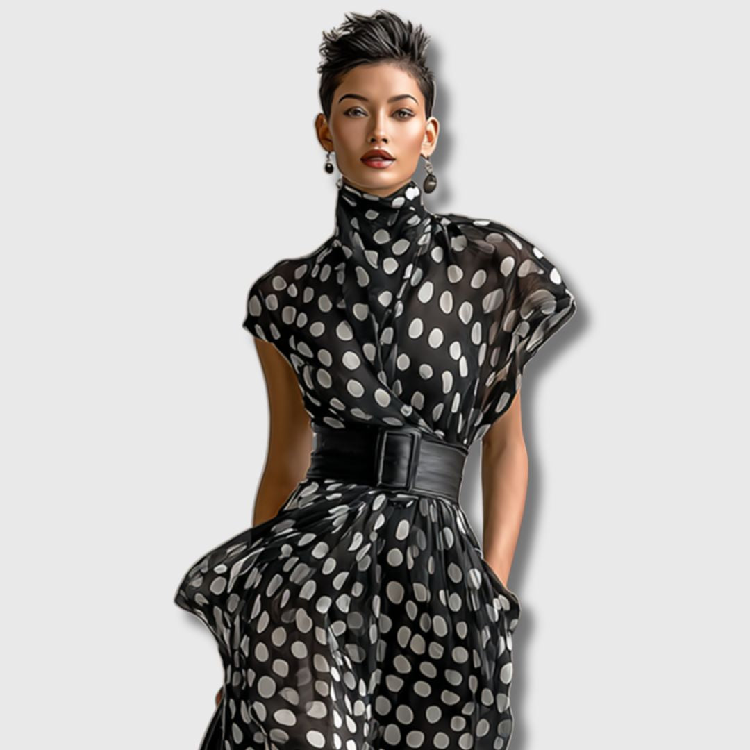 Ova maxi haljina od prozračnog šifona osmišljena je za žene koje vole spoj elegancije i udobnosti. Klasičan uzorak s točkicama u kombinaciji s visokim ovratnikom i dugim padom haljine stvara sofisticiran i moderan izgled. Savršena je za poslovne prigode, svečane večere ili opuštena druženja.