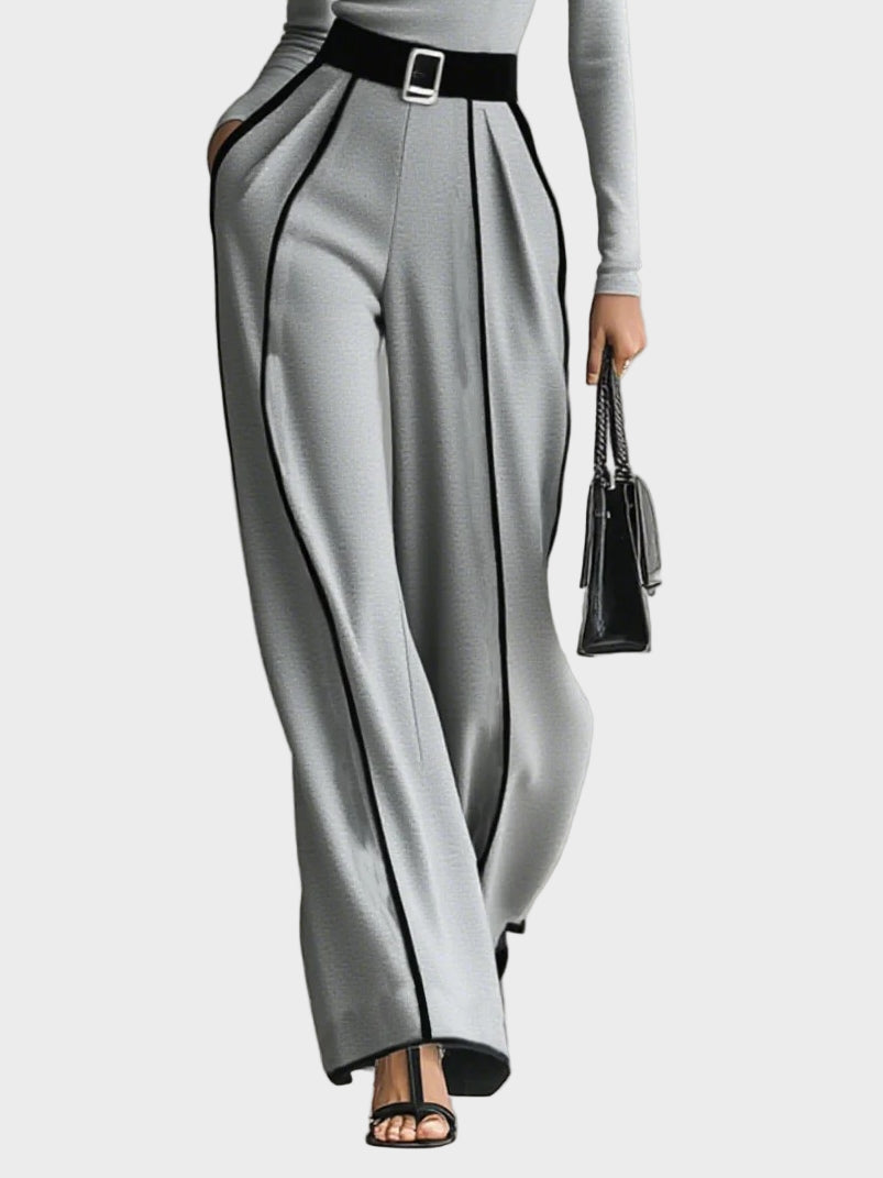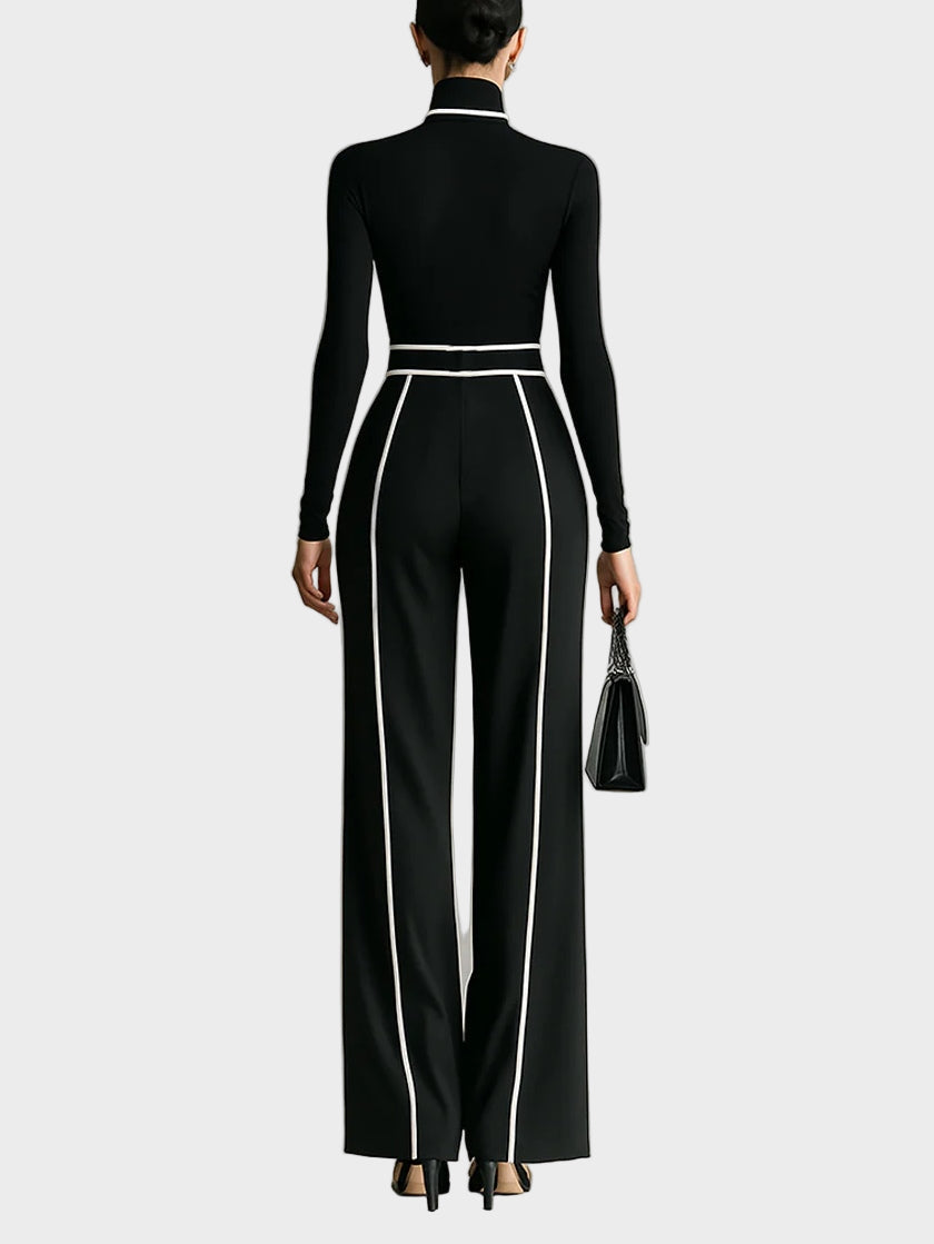 Profinjeno. Samouvjereno. Bezvremenski. Clara je dvodijelni set dizajniran da ostavi dojam bez pretjerivanja. Elegantna majica visokog ovratnika s kontrastnim bijelim rubovima savršeno se slaže s lepršavim hlačama širokih nogavica i pripadajućim remenom koji naglašava struk s besprijekornom sofisticiranošću.